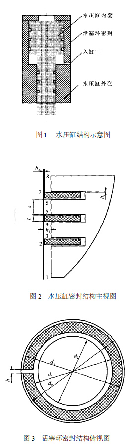 1 理論分析水壓缸結構示意圖示于圖1 ,水壓缸上下兩端的密封均由3 道活塞環(huán)及4 條環(huán)形間縫隙組成。取一端為研究對象,結構示于圖2 、3 。